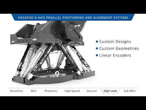 The widest range of standard hexapods includes equipment for industrial production operations where hexapods position heavy loads with sub-micrometer accuracy, as well as tiny versions for sample positioning in beamline studies and high-resolution dynamic positioners for fiber alignment.